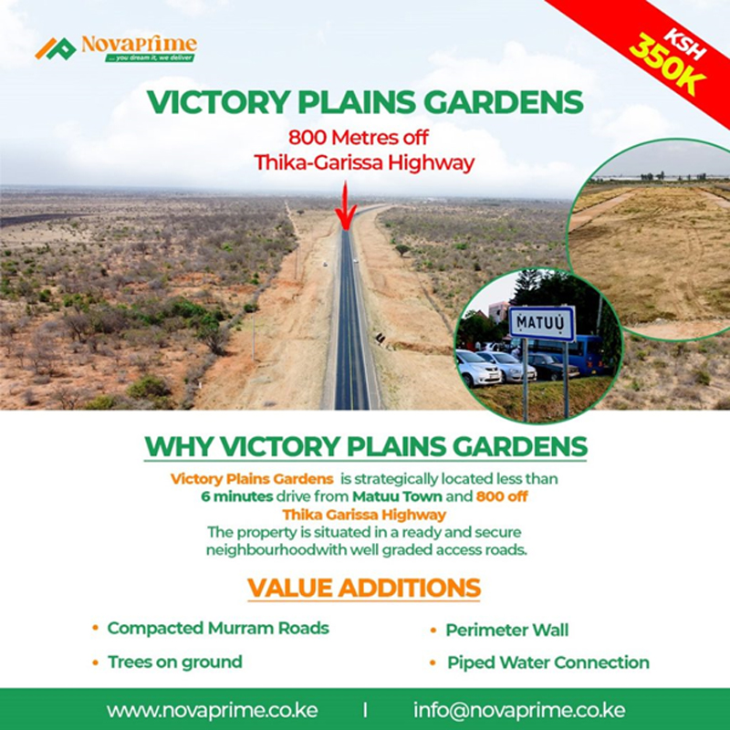 At Novaprime, we have the best projects in Matuu Victory Plains, these are 50×100 plots that are prime with ready title deeds. Located just 800M off the busy Thika Garissa Highway. Read more.